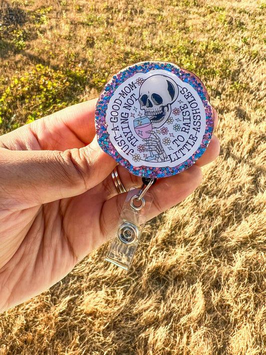 Just a good Mom Trying Not to Raise Little Assholes Badge Reel | Funny Badge Reel |Sassy Badge Reel | ID Holder | Interchangeable Badge Reel